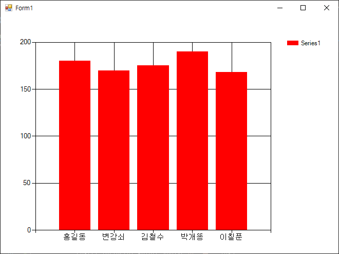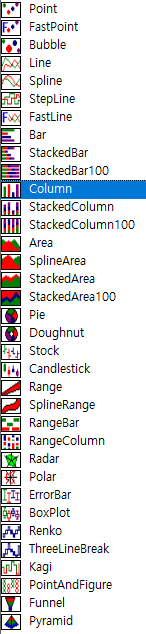 차트종류는 System.Windows.Forms.DataVisualization.Charting.SeriesChartType.차트종류 이런 식으로 표현합니다. 막대그래프의 차트이름은 Column입니다.