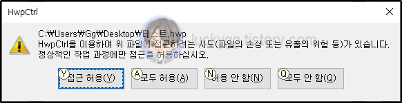 한글과 컴퓨터에서 제공하는 hwpctrl ocx를 사용하여 hwp 파일을 불러오면 아래와 같은 파일 접근 경고 메시지가 생성됩니다.