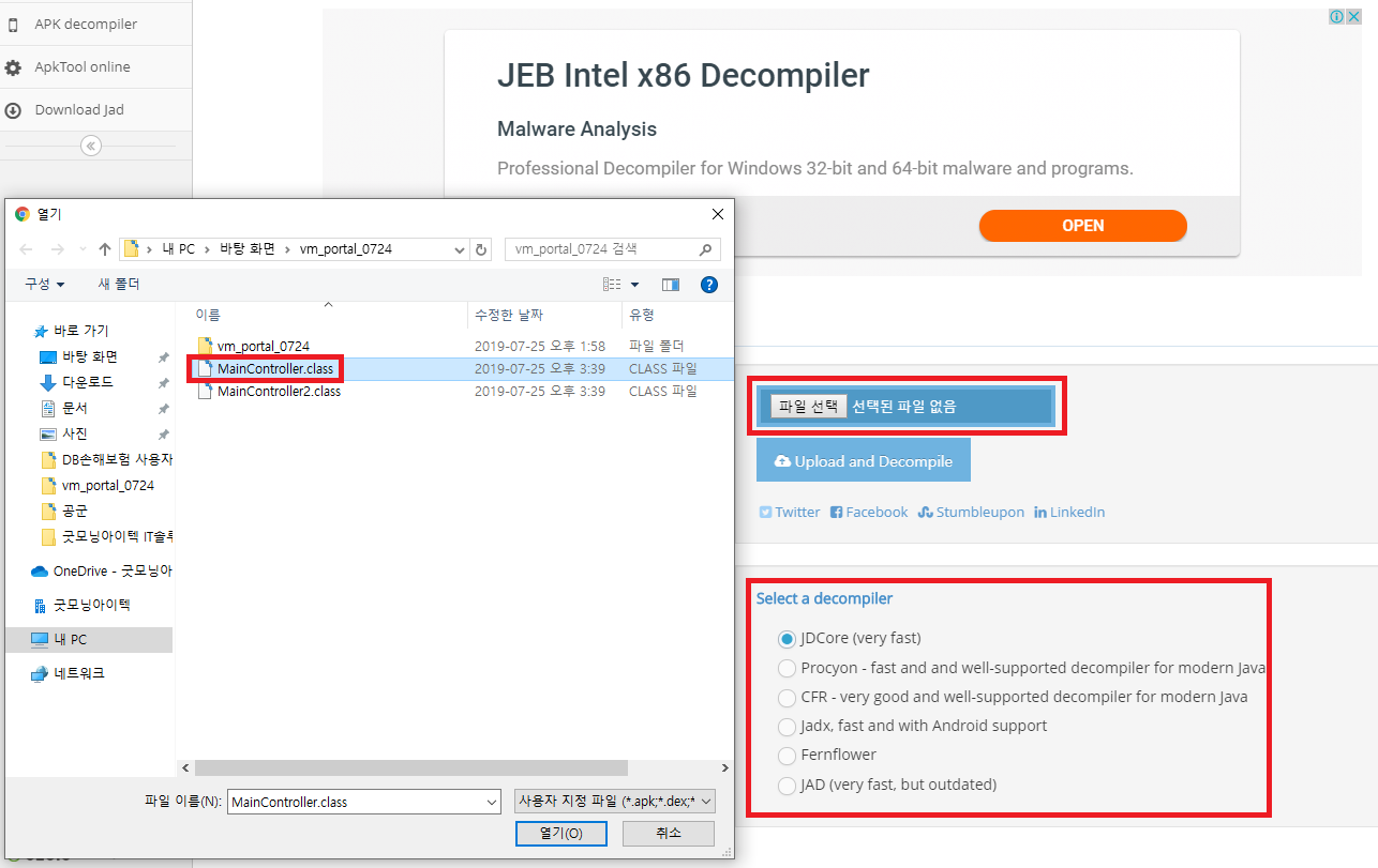 중간에 있는 파일선택을 클릭하여 디컴파일 하고자 하는 jar또는 class파일을 선택합니다.