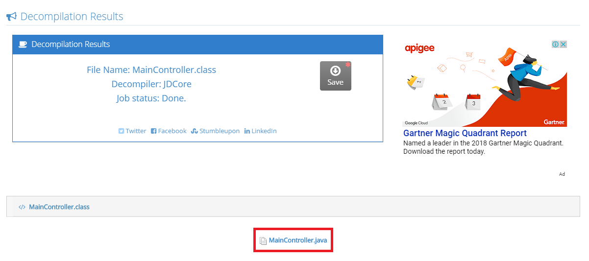 디컴파일이 완료도면 하단에 "파일 이름.java"로 디컴파일 된 파일이 버튼으로 나타납니다.